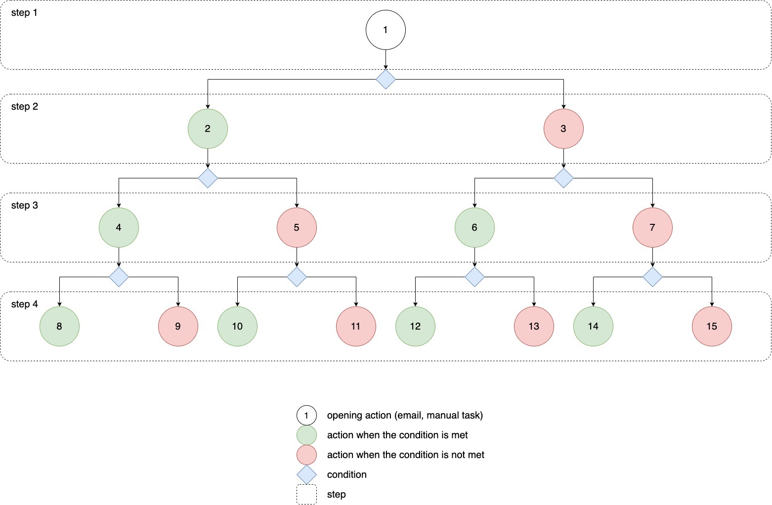 • number can help you differentiate in which path is a specific action (YES or NO). It is assigned based on a possibility that after every action in campaign, there's a condition. So, for example, a simple campaign without a condition will have the following numbers: 1, 2, 4, 8 etc. If you decide to use a condition before opening step, number will start from 2. We know it sounds complicated, so here's a helpful illustration: