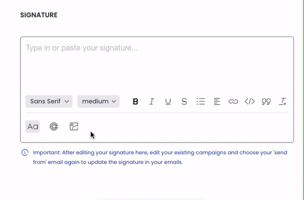If you choose not to include the sender's signature in the email, you can add it to the campaign step of your choice by simply typing or pasting it into the email editor.