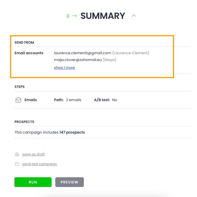 After that, carry on as you would normally do when creating a campaign. In the summary, you’ll see all of the addresses that will be used for sending out emails to your prospects.