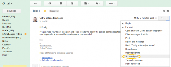 How it works? When you go to Spamcheck by Postmark, you’ll see that it needs the source of your email to score it. The source of an email is the whole of an email message, but not the whole you normally see, but the whole that your server normally sees. How to get to the source? Usually, there’s an option to see the source of a message in the inbox of your email client. So the first thing you need to do is to send the message you want to test to one of your own email addresses. Next, you go to the inbox, open the message and look for some options. In Gmail, for instance, you’ll see the options in the top right corner of the message window. To see the source, you choose ‘Show original’.