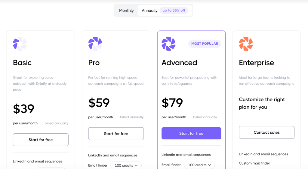 There are four plans in Dripify, with three of them having publicly available pricing. There is no free plan, only a seven-day free trial. You can purchase this LinkedIn automation tool on a monthly or annual basis, and the latter will give you a nice 35% discount.